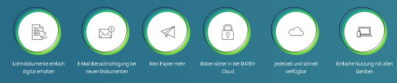 Auch hier bietet unser Softwareanbieter DATEV einen effizienten (und kostenlosen) Prozess an, der das Ausdrucken von Lohn- und Gehaltsunterlagen sowohl auf der Seite des Unternehmens als auch auf der Seite der Mitarbeiter einspart.
